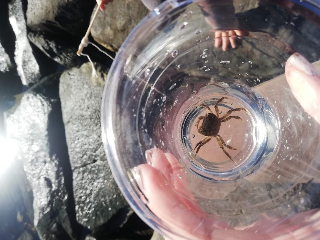 最初に釣り上げたのは私!なるくんをフォローして1匹目です。小さいカニ。